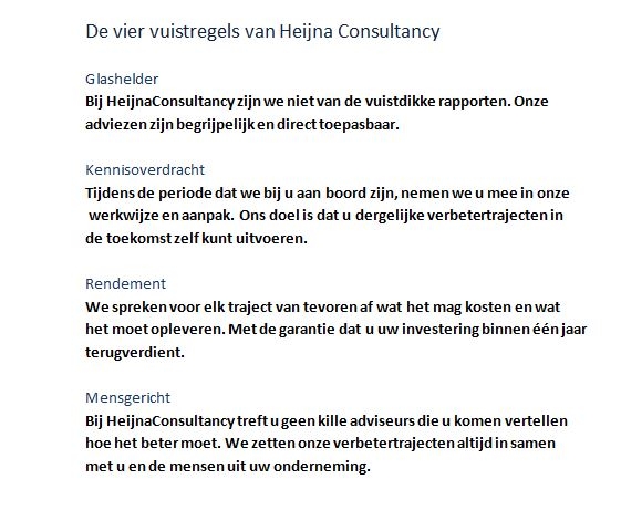 HeijnaConsultancy werkt volgens de principes van Lean. Deze managementfilosofie is gericht op het opsporen en verbeteren (soms beindigen) van alle processen/processtappen/bedrijfsactiviteiten die geen waarde toevoegen. Omdat de efficiency hierdoor toeneemt en de kosten omlaag gaan verbetert het bedrijfsresultaat.
